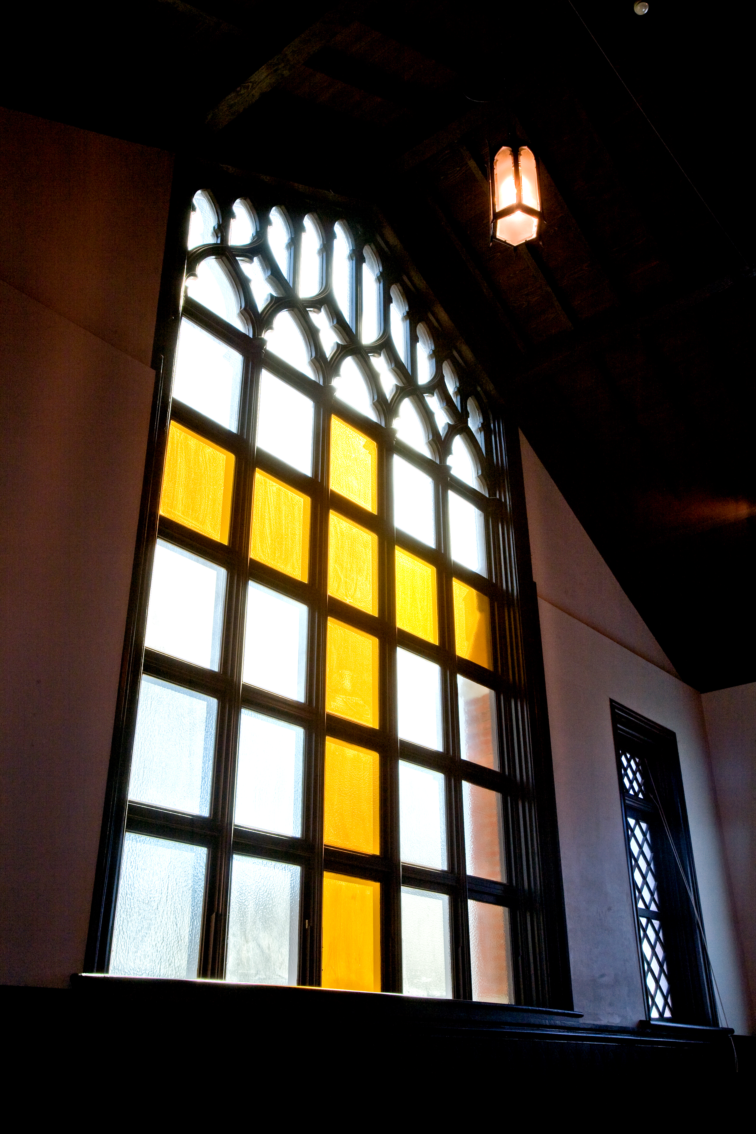 黄色のガラスが十字架の形に配置されており、チャペルの中に柔らかな陽ざしが注ぎこむ