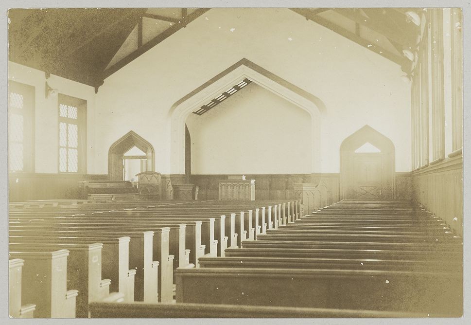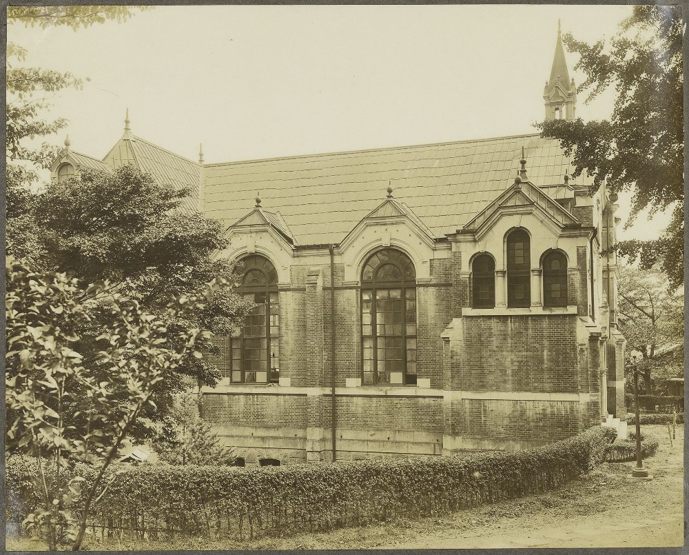 この礼拝堂は1894年から翌年まで学院の建築顧問を務めていたドイツ人の建築家R. ゼール(Richard Seel)によって設計されました。当時の図面などは発見されておらず、建設の規模、詳細は不明で、数少ない古写真から外観の様子がわかる程度です。