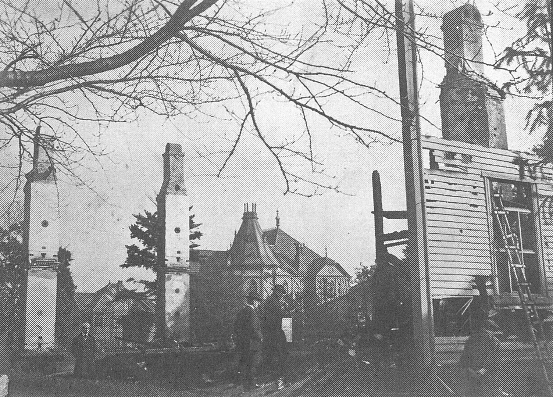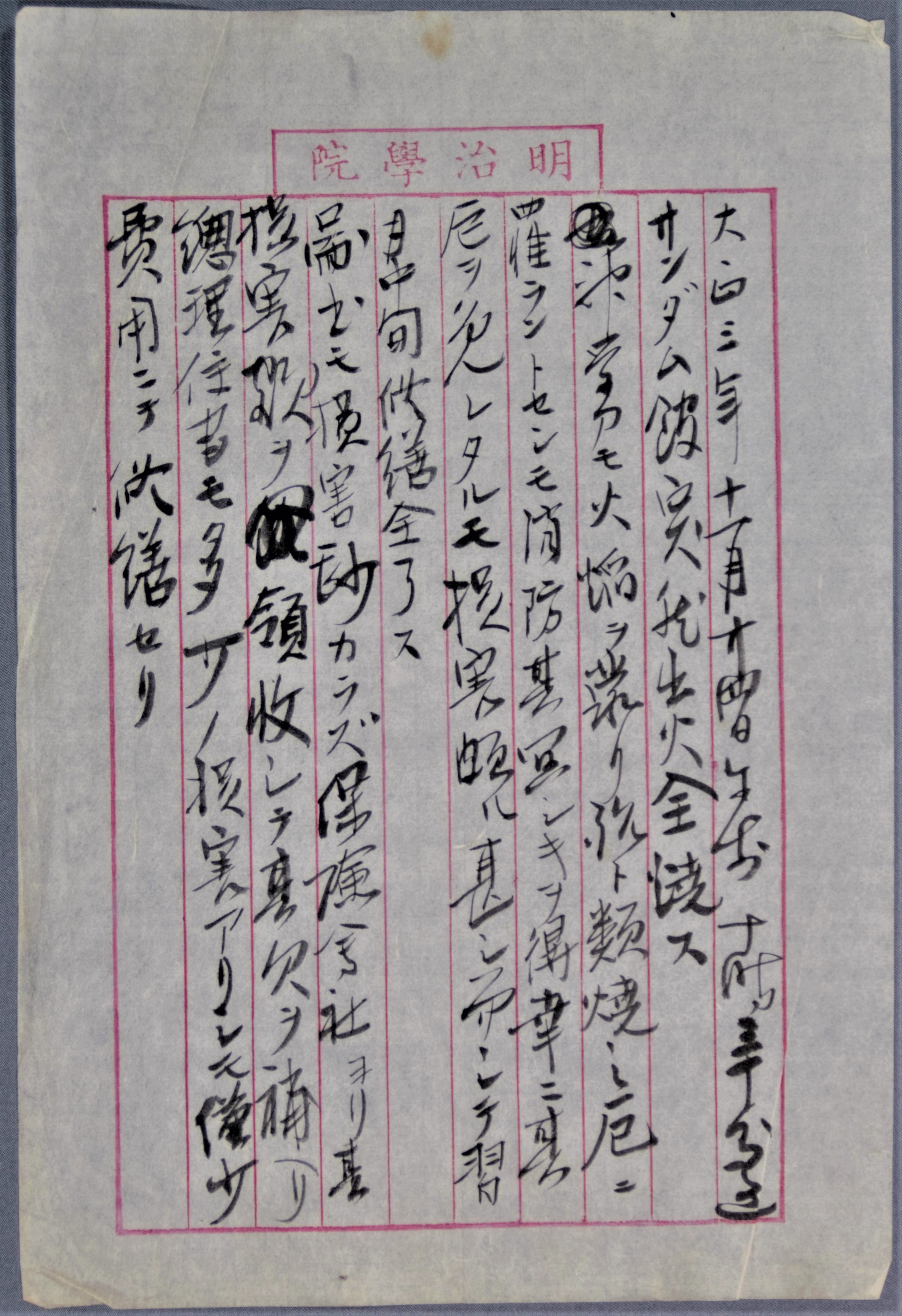 このため学院は礼拝のための施設をサンダム館2階の講堂に移し、ここを礼拝堂としました。ところが1914(大正3)年11月24日の授業中、サンダム館2階講堂の天井から火の手があがり、サンダム館は全焼してしまいます。こうして学院は礼拝を行なう場を失いました。