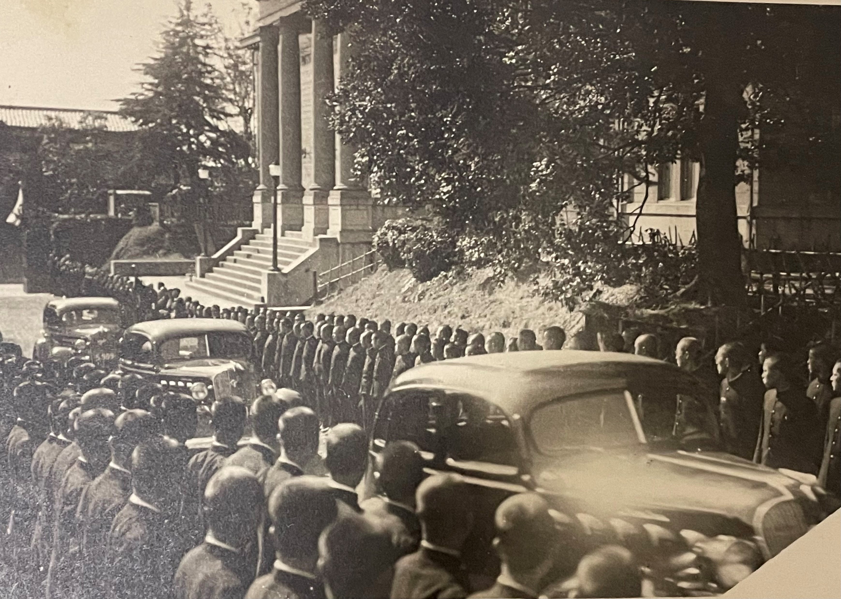 御真影を奉戴した車列とそれを出迎える教職員・学生