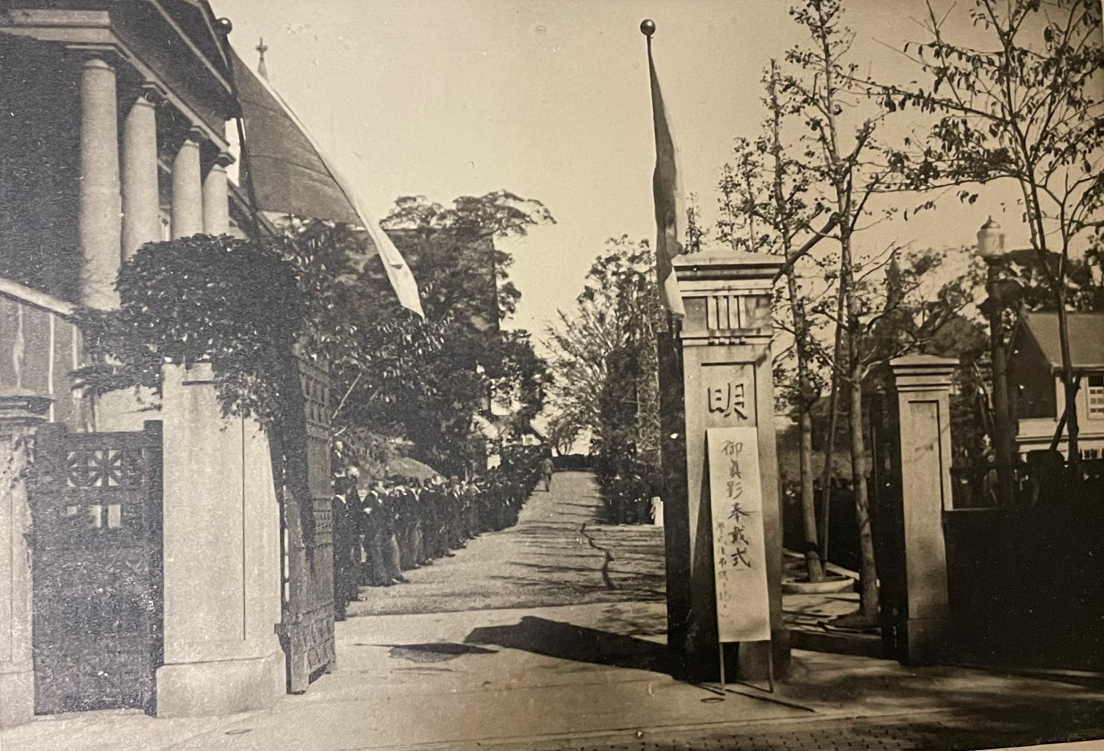 御真影奉戴にあたり、ホキエが文部省に出向いたところ、ホキエが外国人であることを理由に「御真影」を手渡さず、随行していた加藤七郎幹事に手渡したといわれています。学院では教職員・学生が正門からチャペルまで整列して「御真影」を迎えました。