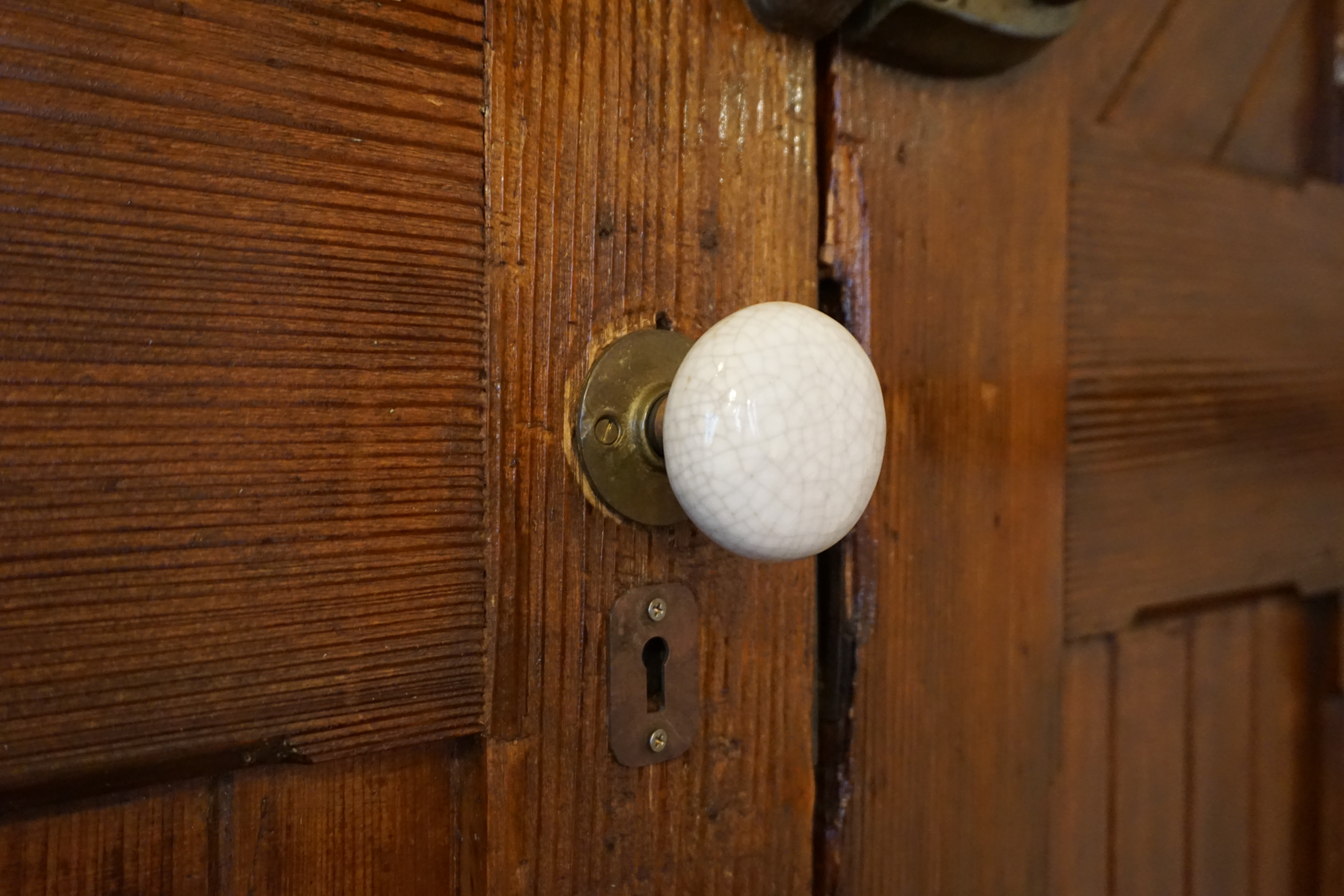 ドアノブが金属製ではなく、焼き物で作られている。洋風住宅に取り入れられた、「和」のテイスト。