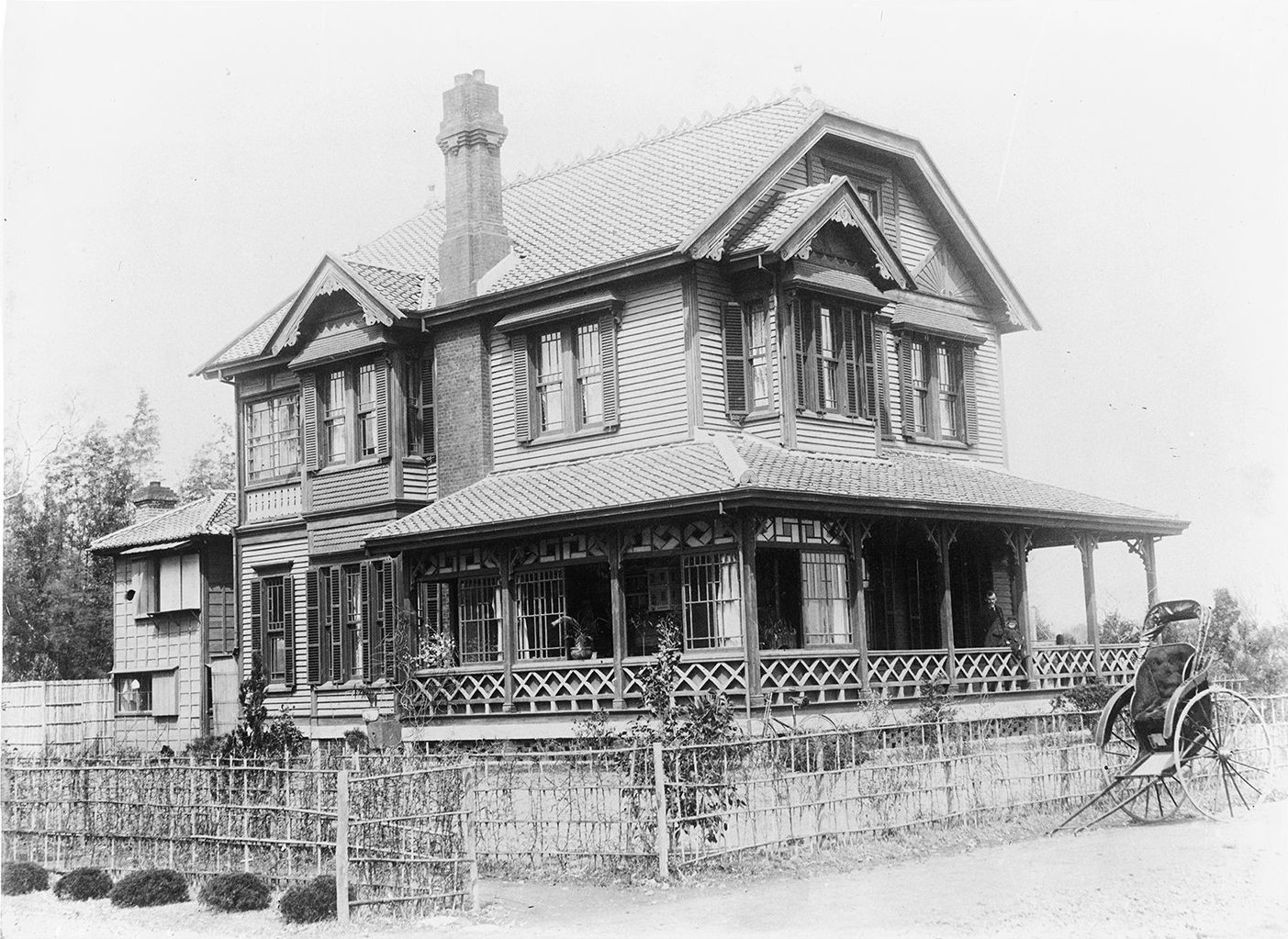 1889(明治22)年頃の竣工と推定される宣教師館。宣教師のH. M. ランディス(Landis, Rev. Henry Mohr)が住んでいたことから、ランディス館と呼ばれました。この建物は、1964(昭和39)年、明治学院高等学校校舎の新築工事に伴い取り壊されました。ランディス館の様式は、下見張り、破風板の飾り、ベランダの方杖、三角形の日輪模様のアップリケなど、19世紀中頃のアメリカの住宅様式(カーペンターゴシック等)の特徴がよく現れていると言えます。
