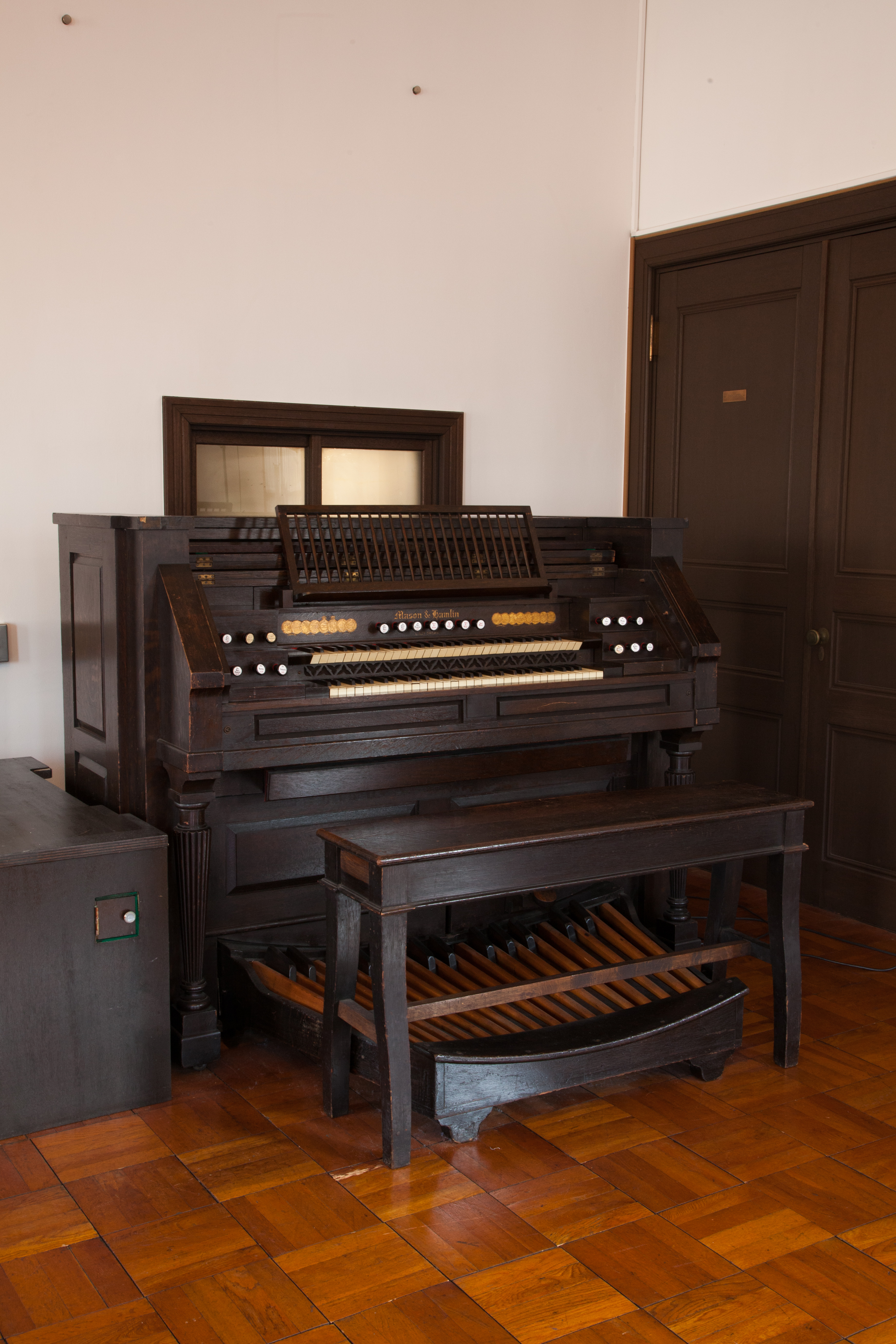 記念館2階大会議室には1914(大正3)年に寄贈された米国メーソン&ハムリン社のリードオルガンが置かれています。A. K. ライシャワー教授(宣教師)の尽力でアメリカの教会信徒が献金をし、メーソン&ハムリン社製の大型リードオルガンを明治学院に寄贈、サンダム館に設置されました。