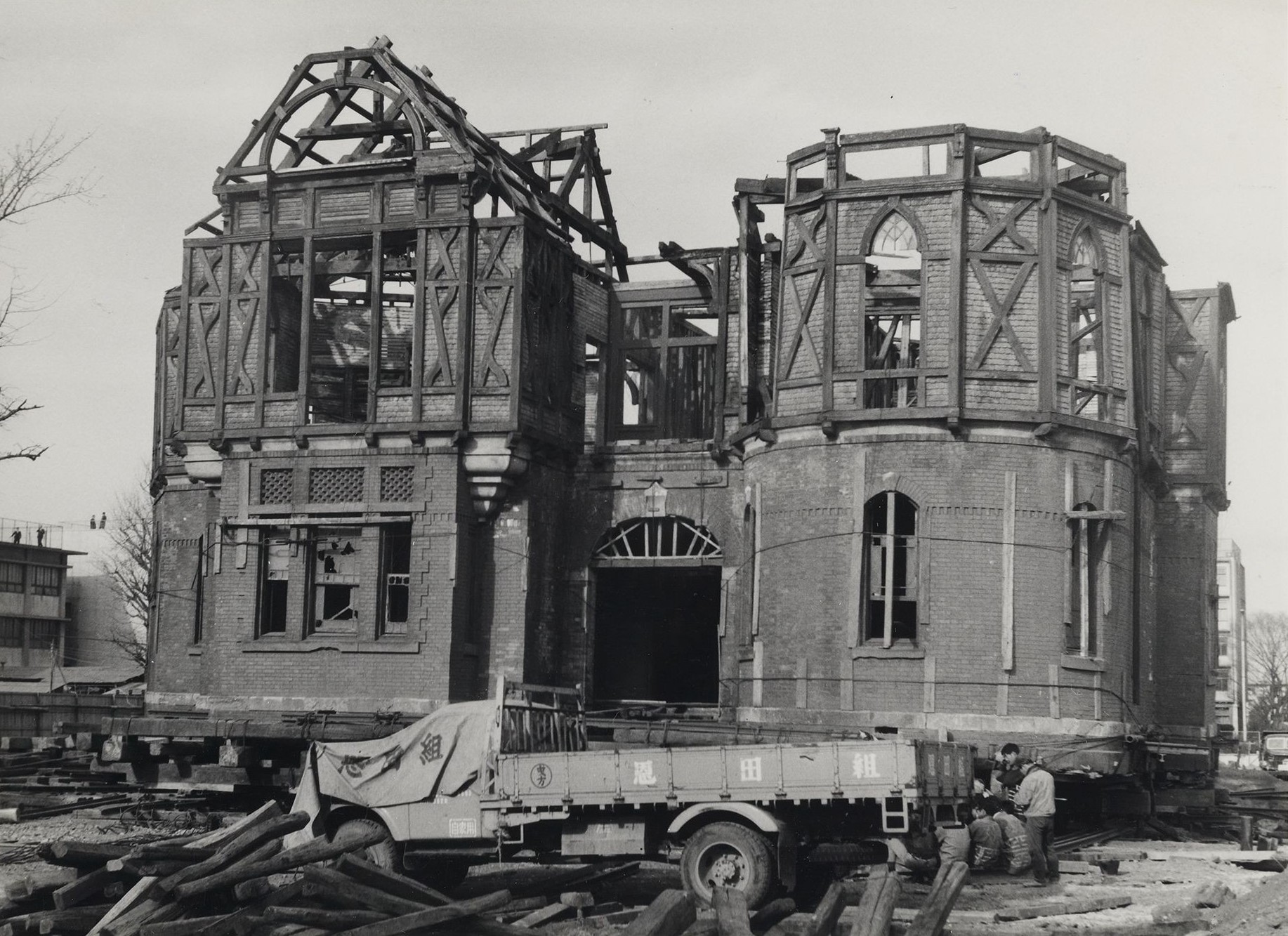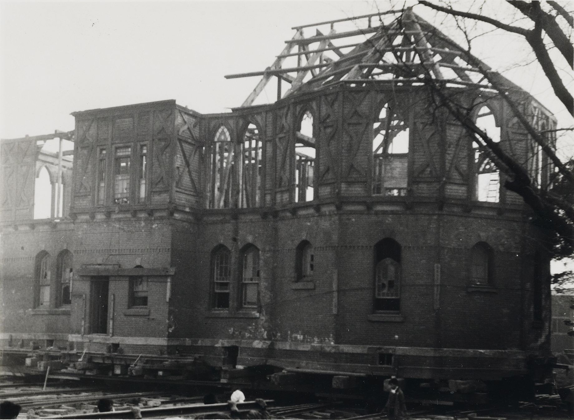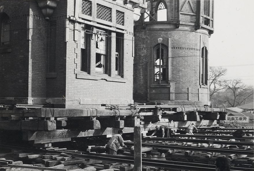 曳家は、建物を解体せずにそのままの状態で移動する建築工法です。インブリー館と明治学院記念館は1964(昭和39)年に現在の位置に曳家されました。この時に、明治学院記念館の向きは90度変わり、現在のような玄関を南に向けた形になりました。また、インブリー館の曳家は、記念館を曳いたのちに行われ、2棟あわせて2ヶ月ほどかかったようです。